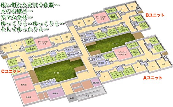 | ■浴室、トイレコーナーにナースコールを設置。安否確認の実施、夜間職員勤務 |